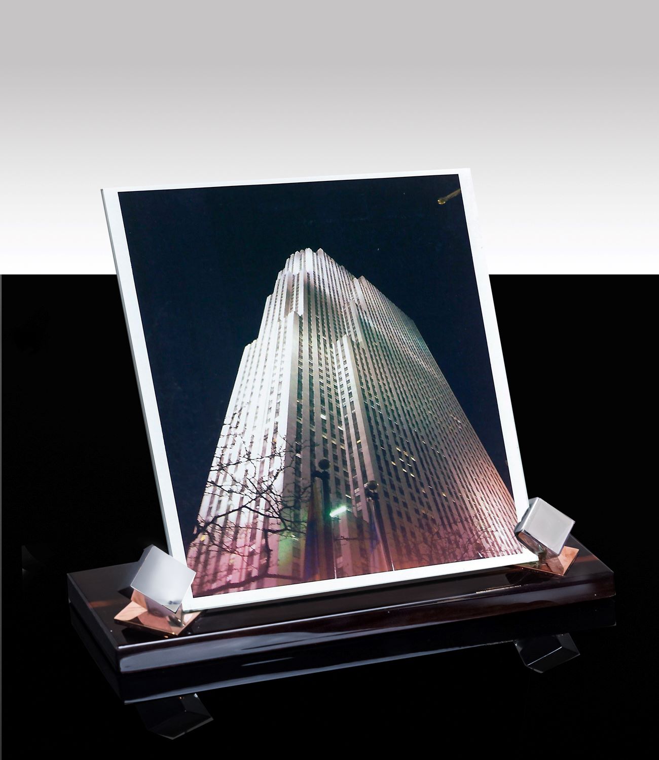 Material: Massiv Maccassare, Hochglanz lackiert. Halterungen in Würfelform auf der Spitze stehend in Messing Edelglanz verchromt auf einer feinen Kupferplatte montiert. 2 Klarglasscheiben, Kanten geschliffen.