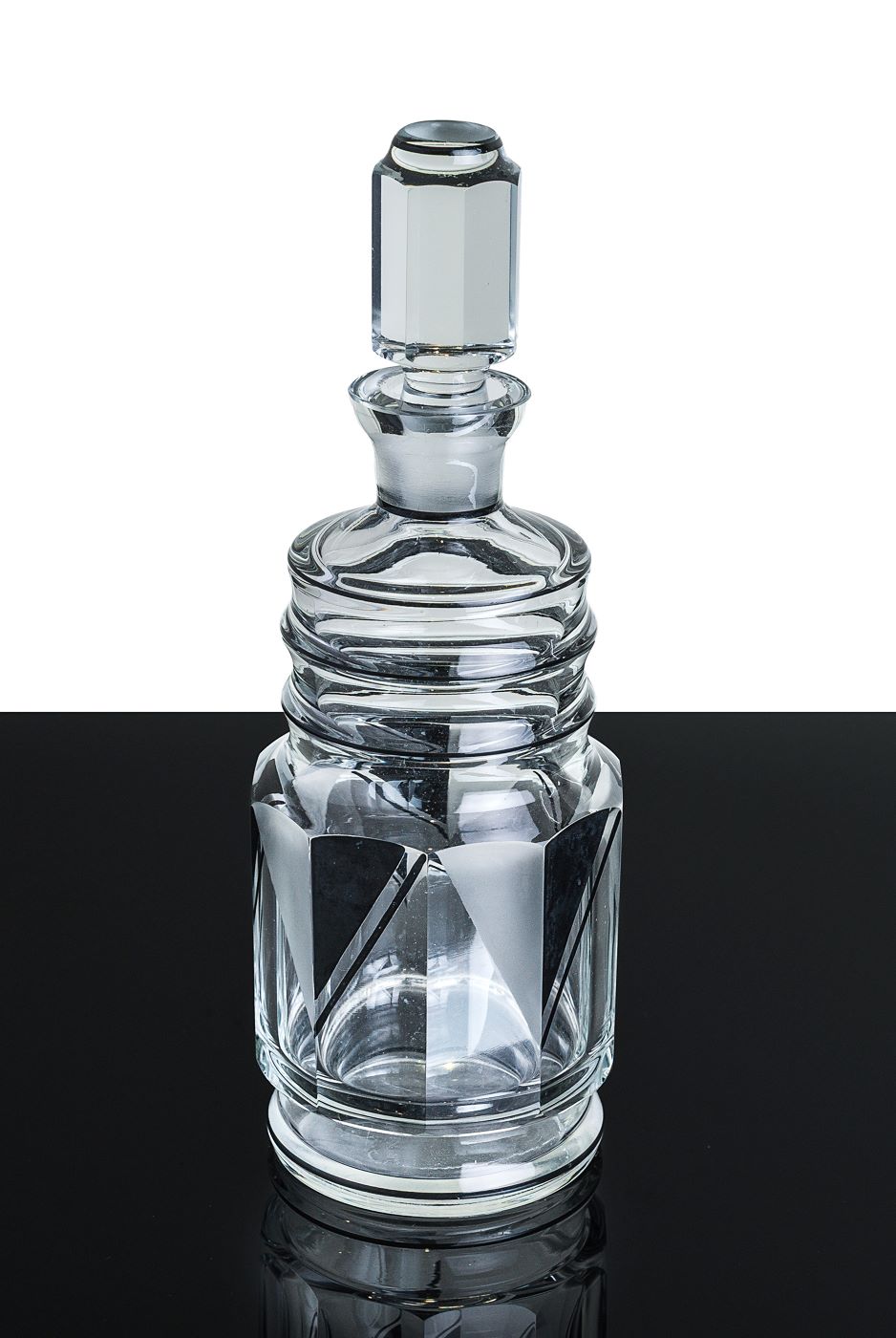 Böhmisches Kristallglas, geschnitten mit geätztem und Schwarzlot-Dekor emailliert in geometrischer Formensprache des Art Deco.