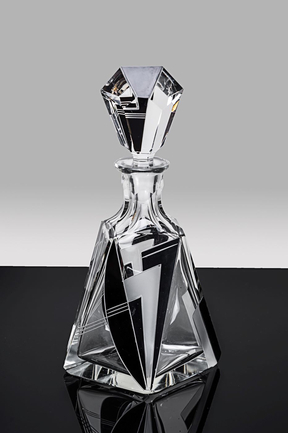 Böhmisches Kristallglas, geschnitten mit geätztem und Schwarzlot-Dekor emailliert in geometrischer Formensprache des Art Deco.