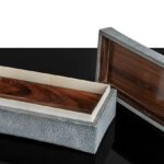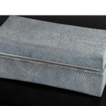 Material: Eingefärbtes Galuchat (Rochenhaut)bezogen in Kaviargrau. Innenausstattung Nussbaum Seidenglanz innen lackiert Einfassung Bein
