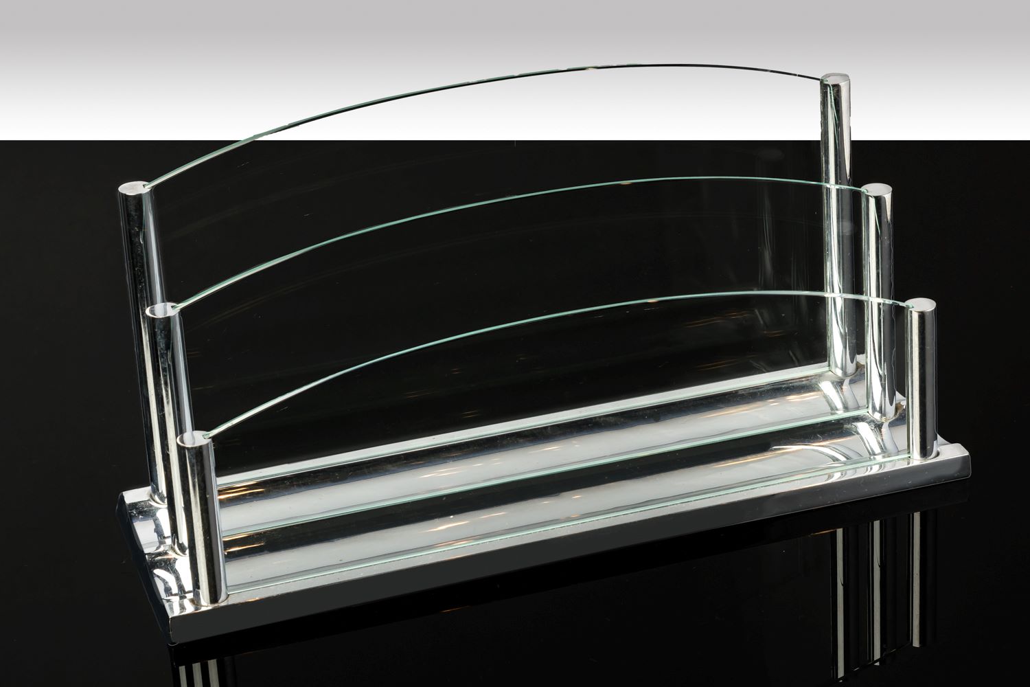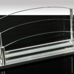 Anmerkung: Das Objekt beeindruckt durch seine Modernistische Formensprache und seiner massiven Materialität. Die Bodenplatte der Ablage hat zwei große Wellen, an deren rechter und linker Seite, jeweils hintereinanderstehend drei kleine Säulen, die sich nach hinten treppenartig erhöhen. In allen 6 Säulen ist jeweils eine Aussparung, die als Führung für das eingesetzte Glas gilt.