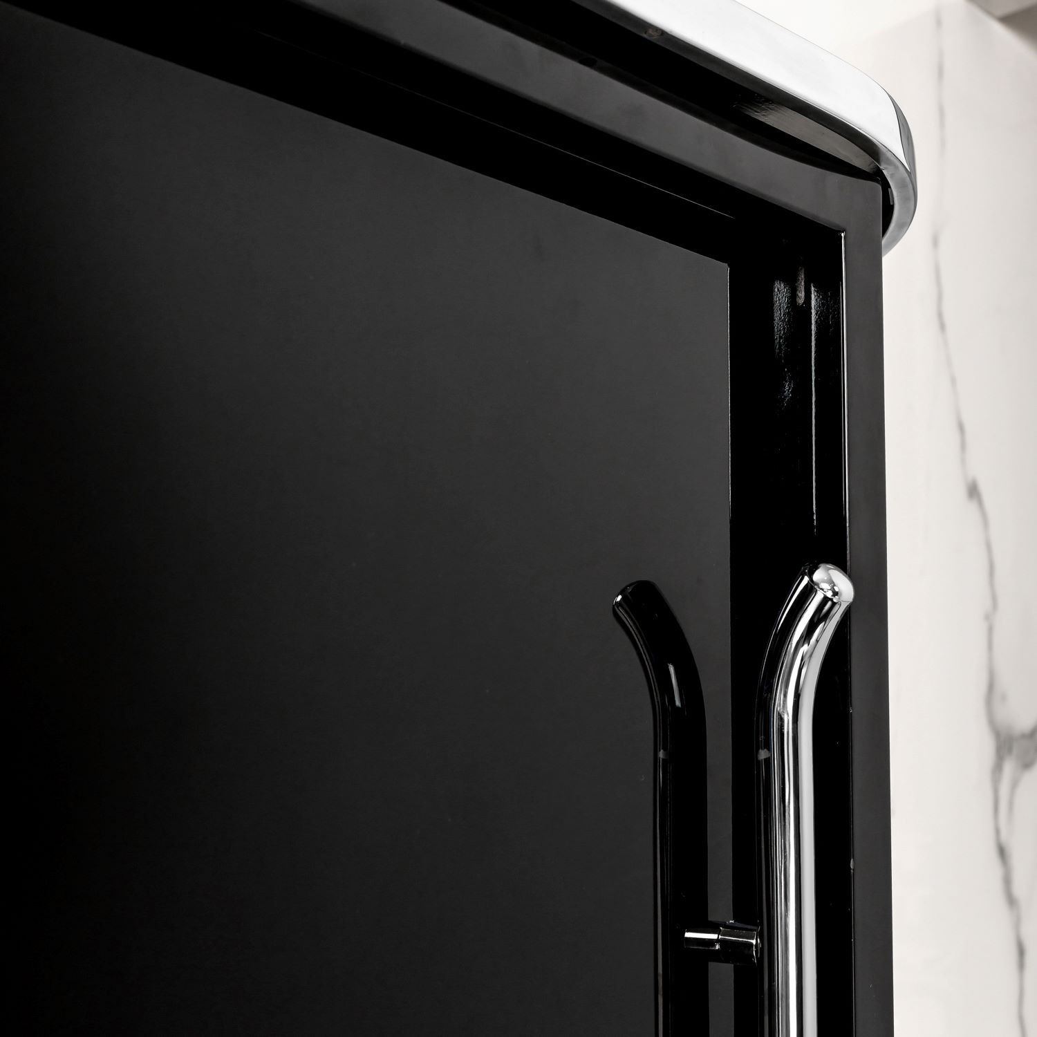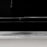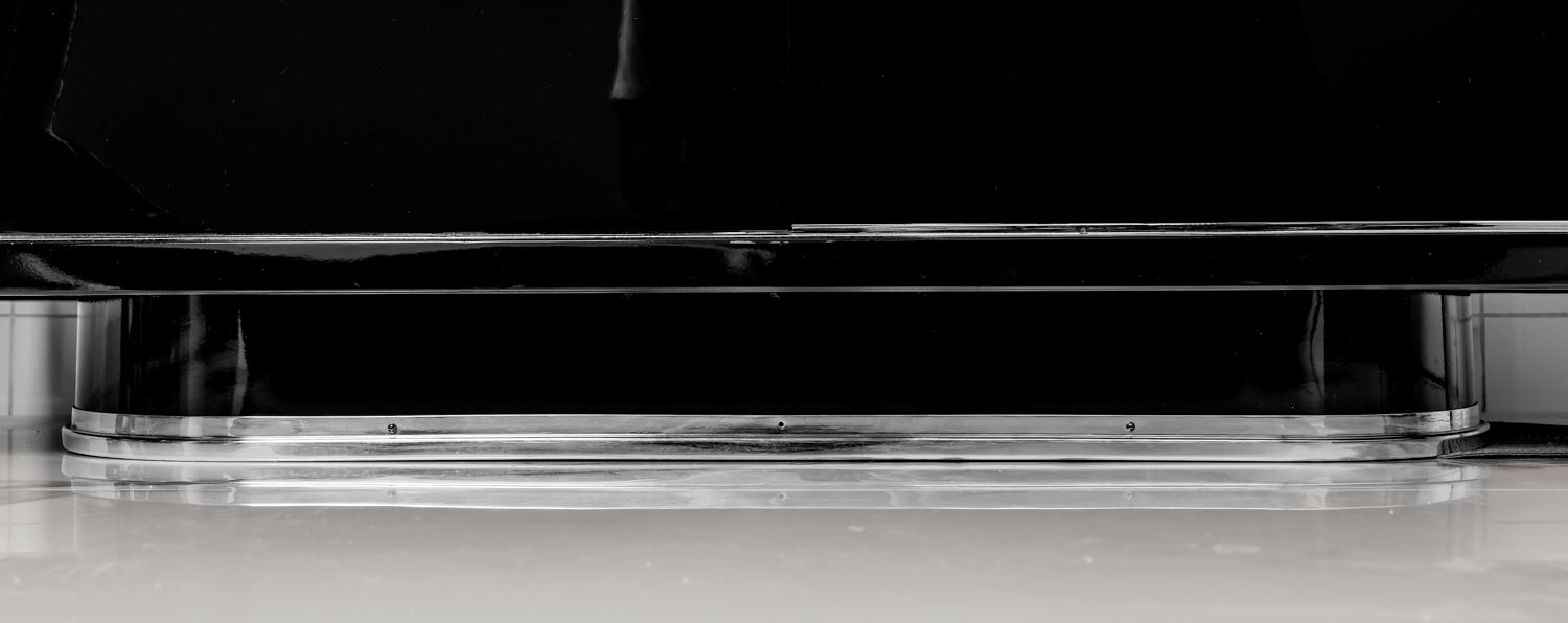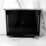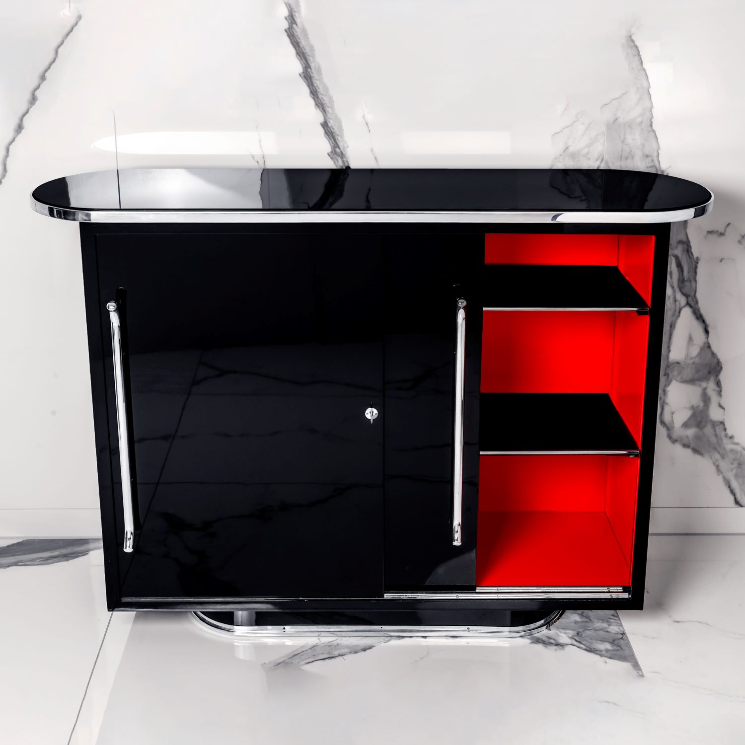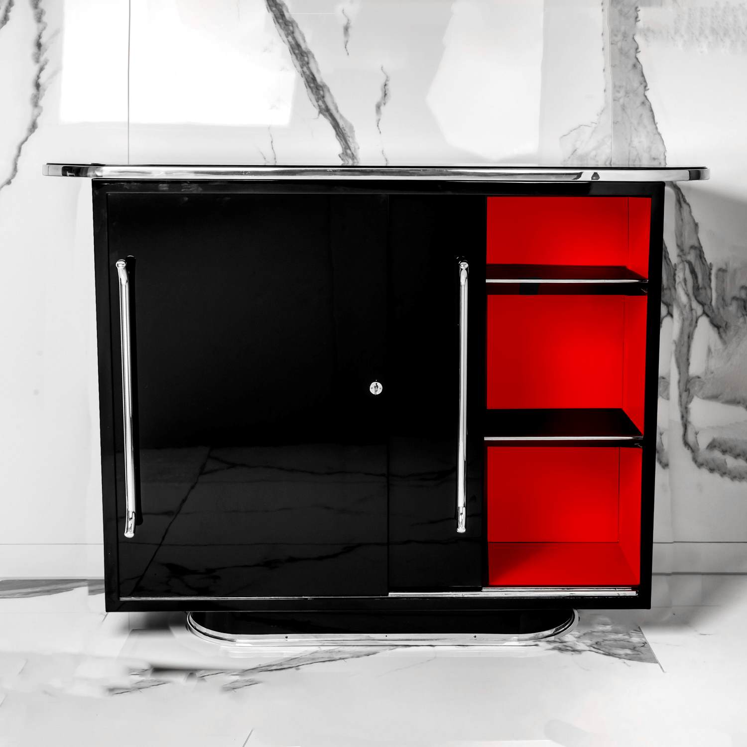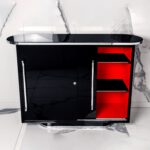 Zwei Schiebetüren und höhenverstellbare Regalböden. Ablageplatte mit Schwarzglas.